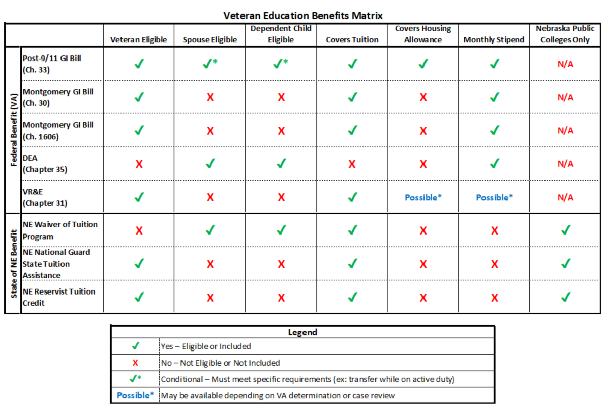 Education benefits are available through both the U.S. Department of Veterans Affairs (VA) and the State of Nebraska. Benefits may apply to Veterans, Active Duty Service Members, National Guard/Reserve members, spouses, and dependents. Each program has specific eligibility requirements and time limits. We strongly encourage Veterans to verify eligibility before enrolling in a program.